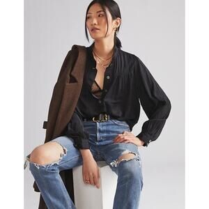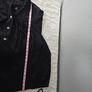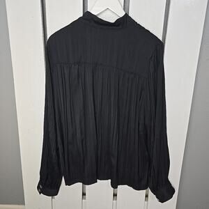 Anthropologie Relaxed Shimmer Satin Henley Popover Pleated Black Blouse XL Chic