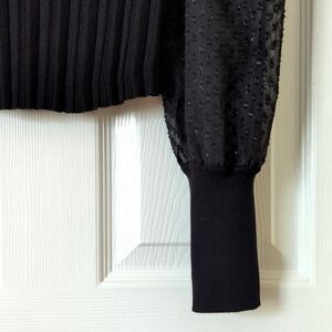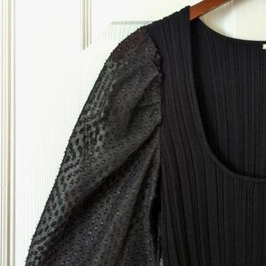 This beautiful black sweater features a scoop neck, a ribbed knit bodice, and sheer long sleeves with puffed shoulders and an eye catching, shimmery design. It's soft, lightweight and comfortable with plenty of stretch as it is form fitting throughout the bodice. It's simple but very versatile, allowing it to be dressed up or down and styled in a variety of ways! High quality!