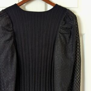 Anthropologie Ribbed Knit Scoop Neck Sheer Shimmer Puff Sleeve Sweater Black S