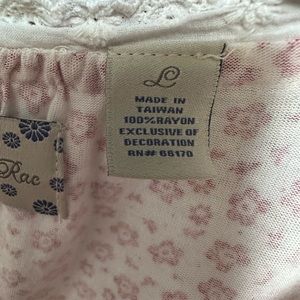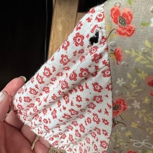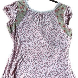 Two different fun jersey patterns make this cute top special. Features ivory subtle lace and ribbon trim. Slightly fitted through waist area for a polished look. Right sleeve has a hole about the size of a grape that should mend easily but I haven’t tried. Super sexy and fun with great details