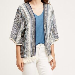 Anthropologie Roffe | Boho Blue Patterned Kimono Cardigan Fringe Hem