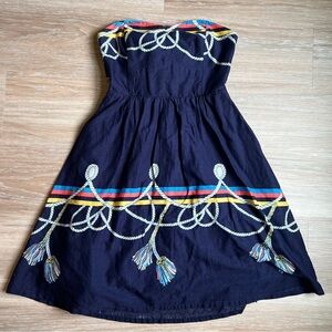 Classic Anthropologie “Roped‑In Dress” designed by Wakana Koike. Navy, strapless corset-style bodice with nautical rope-inspired detailing—polished and timeless. Back zipper; lined. Dress it up for weddings, showers, or date night, or style nautical-chic with a cardigan.