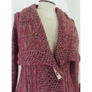 Lovely feminine cardigan sweater by Rosie Neira for Anthropologie. Long fitted sleeves, fit-and-flare tunic length style. Wide shawl collar, faux horn button closure in the front. Red knit lightly marled with black and white. The texture and knit of this cardigan are just beautiful! 45% wool, 45% acrylic, 10% polyester. Lightweight but still warm. Size small, fits true to size. In great gently worn condition.