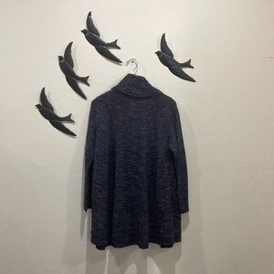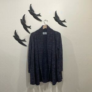 Lovely medium weight knit; Deep purple base with flecks of burgundy & lavender; Open front; Shawl collar; Swingy style; Longer length covers the bum!