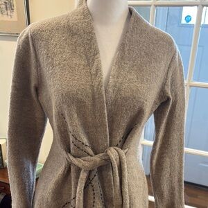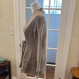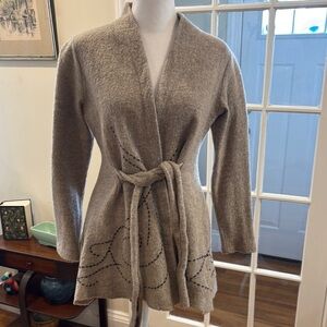 Anthropologie Rosie Neira gray wool sweater with black stitching and tie at waist. Size M. Measurements are 17.5” from armpit to armpit and 26” long.