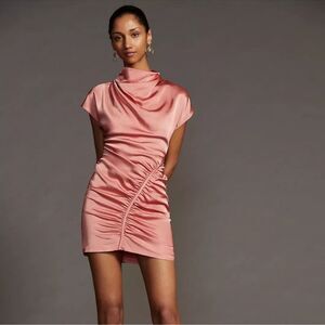 Anthropologie Ruched Asymmetrical Satin Mini Dress NEW Size 2 in Coral Pink