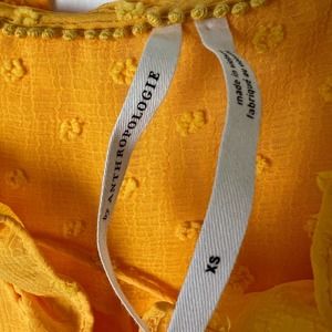 In a cheery buttercup yellow, Anthropologie Ruffle Haida Boho Peasant Blouse, cris cross tie front,  100% polyester, please refer to photo measurements for accurate sizing, one small area on seam with sewing repair, not even noticeable, overall Mint Condition, smoke, free home,