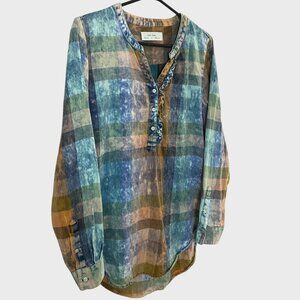 Anthropologie Ruffle Henley Top Acid-Washed Tonal Check Tunic