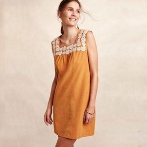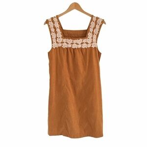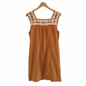 Elegant rust mini dress with delicate white lace detail. Sleeveless and stylish.