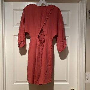 Stylish rust red faux wrap dress with a tie front. Perfect for any occasion.