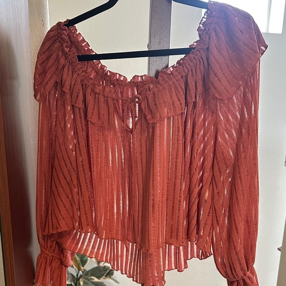 Chic rust blouse with ruffle details. Lightweight and stylish. Perfect for versatile wear.