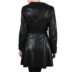 This gorgeous winter coat features shearling inserts around neck, sleeves wrists and fully linning to keep you super warm during the cold days, it comes with a matching waist Tie knot belt, front hook closure. Black color. Perfect to wear it with any wardrobe in the cold winter days.