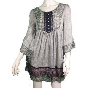 This elegant tunic Anthropologie Ryu features a sophisticated gray and black color palette with a tiered design. The 3/4 bell sleeves and buttoned details add a touch of flair to its flowing silhouette, making it perfect for a chic, casual look.