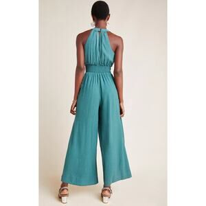 Anthropologie Bionda Plisse Jumpsuit Green Sleeveless Smocked Wide Leg