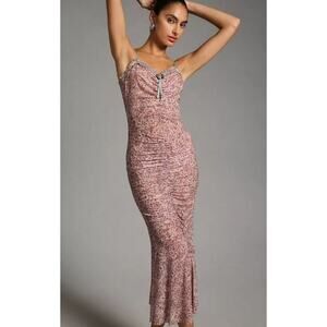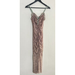 Anthropologie S Dress Mesh Ruched Midi Mauve Strappy Semi Sheer NEW