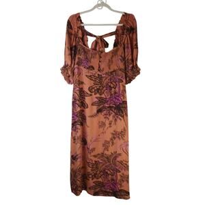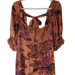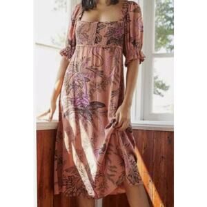 Anthropologie SZ XS Puff Sleeve Smocked Dress Square Neckline Bird Print Orange