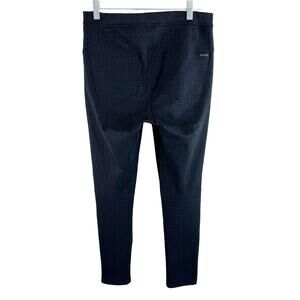 Excellent preowned condition. Black elastic waist skinny leg pull on office-wear professional pants. See photo for pants pattern. Have faux front pockets, open back pockets. Polyester/rayon/spandex material. Approx. measurements: Waist 30", inseam 29", rise 10.5". Size M.