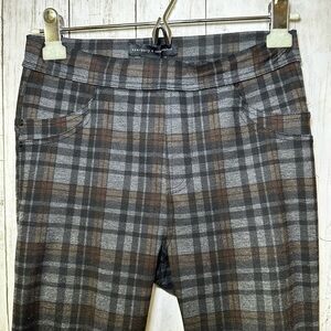 - Style: High-rise, pull-on, plaid/brown motif, stretchy
