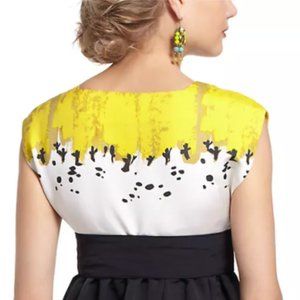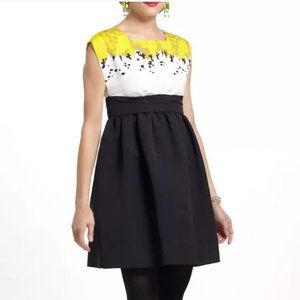 This eye-catching frock makes it a cinch to dress for the office and ease right into date night. By Sariah, a collaboration between Anthropologie and calligraphy artist Sariah Carson. It has a retro feeling, with a sophisticated abstract print on the bodice, higher waist and full black skirt with a wide sash. Fabric is a woven faille which has tiny ribs and a slight sheen.
