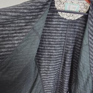 This Anthropologie Saturday Sunday open front cardigan in green and black reads like a minimalist renaissance layer with its soft knit, tonal stripes, and relaxed drape. Women’s size large. The silhouette falls with an easy fluid line and the fringe trim at the hem adds a subtle textured finish without moving the piece into boho.