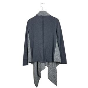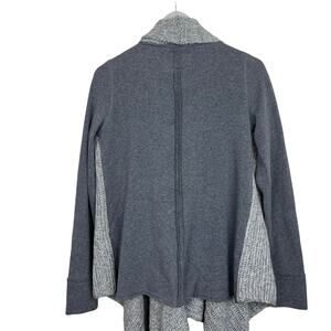 Anthropologie Saturday Sunday Casado Open Cardigan Sweater with waterfall detail. The sleeves and interior feel like a super soft and cozy sweatshirt fleece material while the front is marbled yarn sweater material. Sweater trim is 51% nylon, 45% acrylic, and 4% angora. Body is 60% cotton and 40% polyester. This is such a comfortable and versatile sweater.