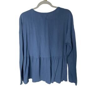The Anthropologie Saturday Sunday Peplum Top is a navy blue henley-style top with a flattering babydoll silhouette, featuring a peplum hem for a feminine touch.