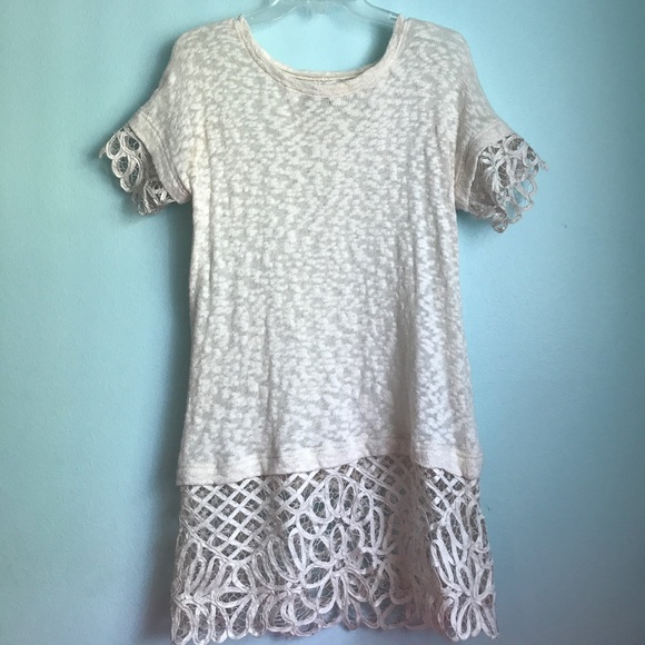 Slightly see through cotton top with adorable lattice like details at the sleeve and bottom. Super cute with skinny jeans and some sandals. Size small but could fit an xs-medium. There is a slight deodorant stain on both armpits (but I haven't tried to get it out).