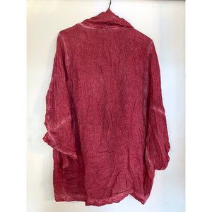 Front piece loops over your neck and criss-crosses in front to create a lovely drape. I love the relaxed fit and this slightly distressed raspberry color. It's labelled XS/S, but is oversized, as pictured. 100% rayon. Worn only twice.