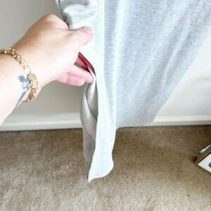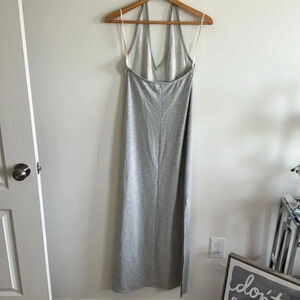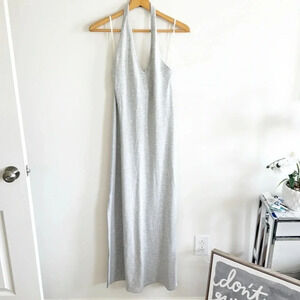 From Saturday Sunday. super comfy and cute halter maxi dress with side slits. Thicker knit. unlined, heathered gray jersey material with great stretch. Made with Rayon, cotton, poly, and spandex