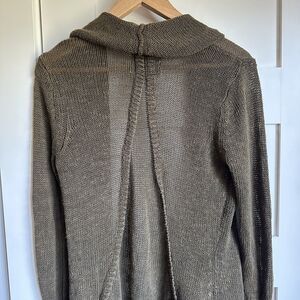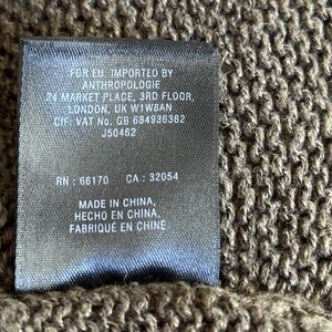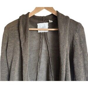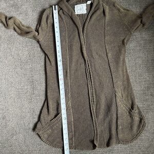 Anthropologie Angel of the North Scalloped Hem Open Front Cardigan, size S. Olive green knit with shawl neck, no closure. Slightly textured knit. Has V seam on the back. Two side pockets. Long cuffs that can be folded.