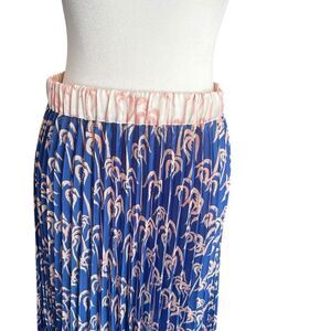 Beautiful pleated midi skirt by Scotch & Soda Amsterdam, also sold at Anthropologie. Features a vibrant blue base with blush pink palm leaf print, soft pleats for effortless movement, and an easy pull-on elastic waistband. Made from 100% recycled polyester — lightweight and flowy. Style with a tucked blouse or tee for work, brunch, vacation, or a polished preppy look.