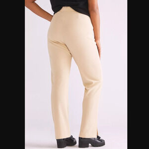 Crafted of a soft polyester blend with elastane for structure, these pants feature a front seam and slit hem detailing adding a unique twist. The pull-on styling allows for easy off-duty dressing.