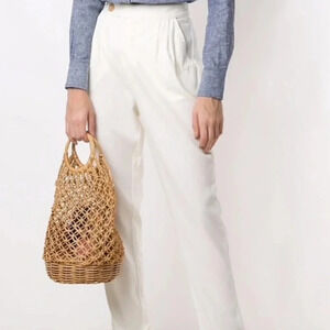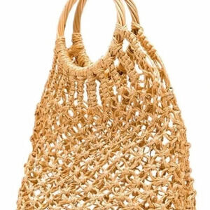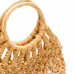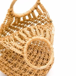 Natural macramé bucket bag from Serpui featuring a woven design, abacá top handles.