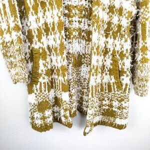 This eye-catching "coatigan" is the slouchier, softer alternative to a more structured coat. Cozy and lightweight, it's the perfect solution for not-quite-freezing conditions. Yellow and white fringe-y knit open front cardigan/sweater/jacket
