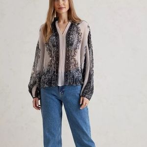 Elegant sheer blouse with black intricate patterns. Flowy design for a sophisticated look.