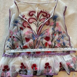 Vibrant floral design on a sleeveless top. Features a mix of colors for a lively look. Ideal for casual outings. So stunning on! In perfect condition! #bohotop #bohochic #anthropologie #sheer #embroidered #colorful #feminine