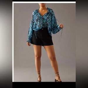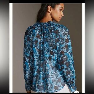 Anthropologie Sheer Printed Peasant Blouse Blue Floral Ruffles size Small