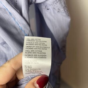 Design features: Tonal embroidered eyelet and cutwork throughout; patchwork/paneled seaming; point collar; snap cuffs