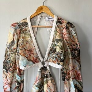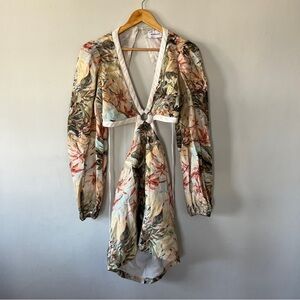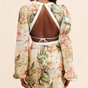 Floral printed mini dress in a fitted silhouette w/ cutout detailing leading to an open back