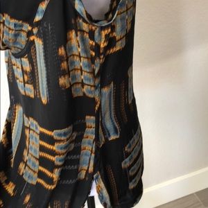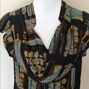 One.September for Anthropologie Batik or tribal print top in light blue and gold on dark navy blue background. Notched mandarin style collar cascades into draped cowl neckline. Cap sleeves and side buttons in brass that allow for showing a little skin. Super chic piece will make your suit or slacks look so expensive.