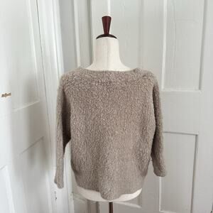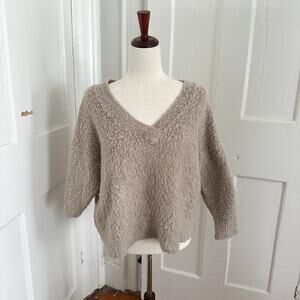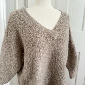 Super cute tan fuzzy v-neck Simone sweater from Anthropolgie! Worn a few times and in good condition, please see closeup pictures! Super soft material! A true closet staple. Merino wool blend.