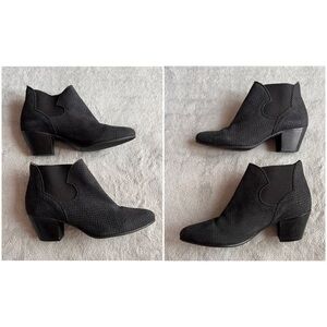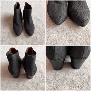Great used condition. Distressed Croc Chelsea Ankle Boots by Anthropologie brand Sixtyseven in black. Chic, edgy aesthetic, a versatile capsule wardrobe piece for the season that can be dressed up or worn casually. Slip-on ankle boots with textured croc/snake embossed leather upper and stretchy elastic side panels for easy on/off, see video. Slightly pointed toe and short stacked heel. Manufacturer-intended distressed finish. Made in Spain. Note: light wear with minor streetwear to bottom sole and a few scuffs/knicks to heels, see photos. Size 37, see photos for measurements.