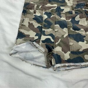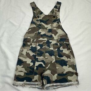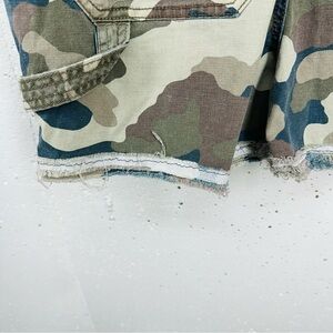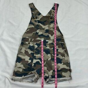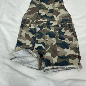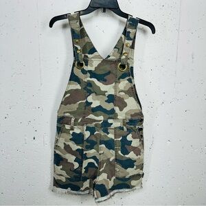 Anthropologie Size 6 Olive Camo Camouflage raw hem Overall Shorts Shortalls in good preowned condition. Honestly I do not know if these were made this way or they are cut offs.