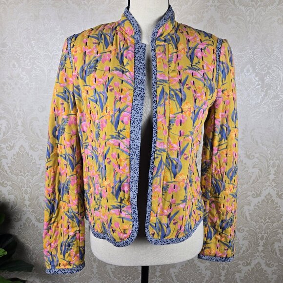 Quilted style jacket has a yellow background with a floral print with a contrasting blue floral fabric accent trim and lining. Blue stitching in vertical lines all over. Mandarin collar. Hidden hook and eye closure down the front. Full lined. No pockets.