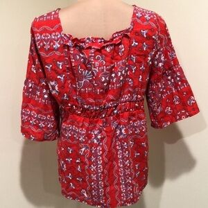 Excellent condition no stains rips or fading. 3/4 length sleeve, bell sleeve, v-neck, pullover top. Red with turquoise blue and white print.