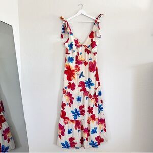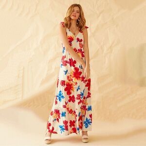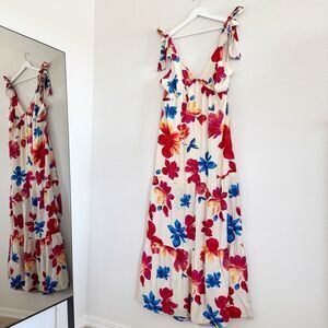 Tied at the shoulders and falling to a floor-sweeping hem, this tiered maxi dress is absolutely stunning in a multicolor floral print on a cream base. Ruffle trim and a little cutout at the back adds to the allure.