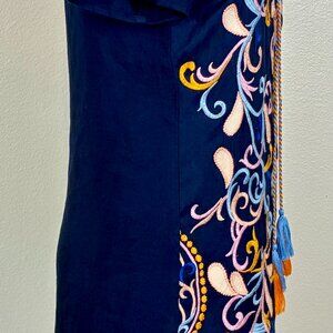 Anthropologie Skies Are Blue Mini Dress XS Embroidered Floral Navy Tassel Boho