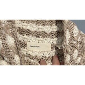 The Anthropologie Sleeping On Snow Crochet Popcorn Sweater in size M is a stylish and versatile piece perfect for various occasions. This chunky-knit sweater features a mock neck and long sleeves, making it ideal for travel, casual outings, or business meetings. Hand wash only to preserve its quality. Made from a wool blend, nylon, viscose, cashmere, and cotton, this sweater is not only comfortable but also stretchy and breathable. The beige color and crochet fabric add a touch of elegance to this pullover sweater from the brand Sleeping on Snow.