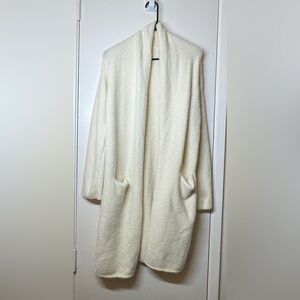 Open front cardigan, longline, front pockets, alpaca wool blend, cozy, soft, some stretch, drawled neck, neutral