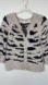 Beige cardigan with abstract black markings has button front with large decorative buttons and crew neck. 3/4 length raglan sleeves with ribbed cuffs. Knit is large loose weave and fuzzy due to mohair.